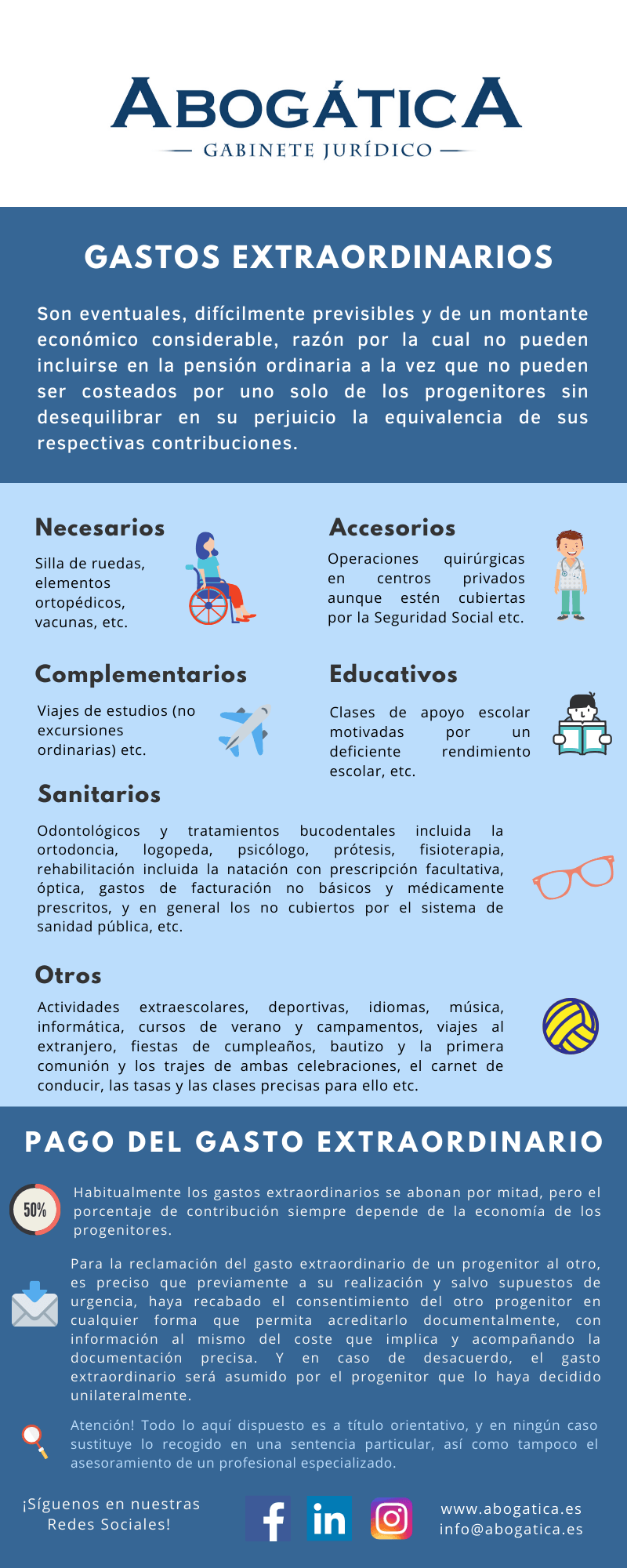 - Ello no significa que hayan de ser siempre imprescindibles y necesarios (silla de ruedas, elementos ortopédicos, vacunas, asistencia de terceras personas en caso de enfermedad, etc.), cabe también que sean accesorios (operaciones quirúrgicas en centros privados aunque estén cubiertas por la Seguridad Social, etc.), o simplemente complementarios (viajes de estudios etc.).